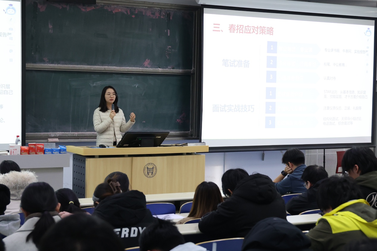 会上,霍文堉结合近三年考研数据与就业市场动态,着重强调,面对多元就业格局,同学们需及时调整心态,摒弃“单一赛道”思维,树立“就业优先、多向发力”的求职理念,牢牢把握春招这一就业关键契机。针对春招季特点,她从就业资源挖掘、招聘信息筛选、求职期望定位三个维度展开讲解,引导同学们结合专业特长与职业规划合理设定求职目标。同时,她围绕简历制作、投递技巧、笔面试备考等核心环节给出实用建议,鼓励同学们主动出击、全面准备,把握好春招黄金窗口期,充分提升就业能力。